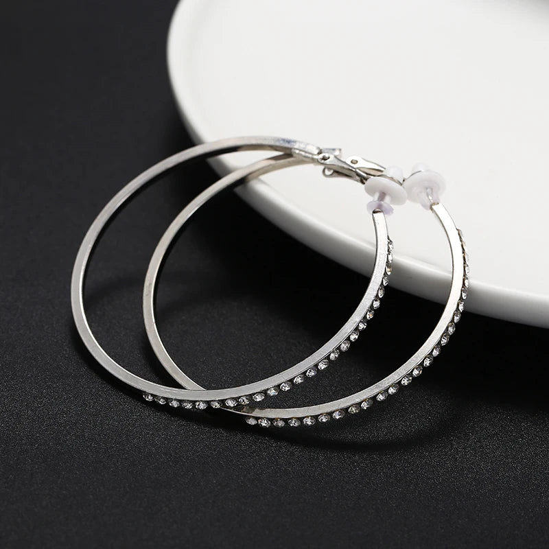 Large Rhinestone Clip Earrings | Gold Silver Circle Hoops No Piercing