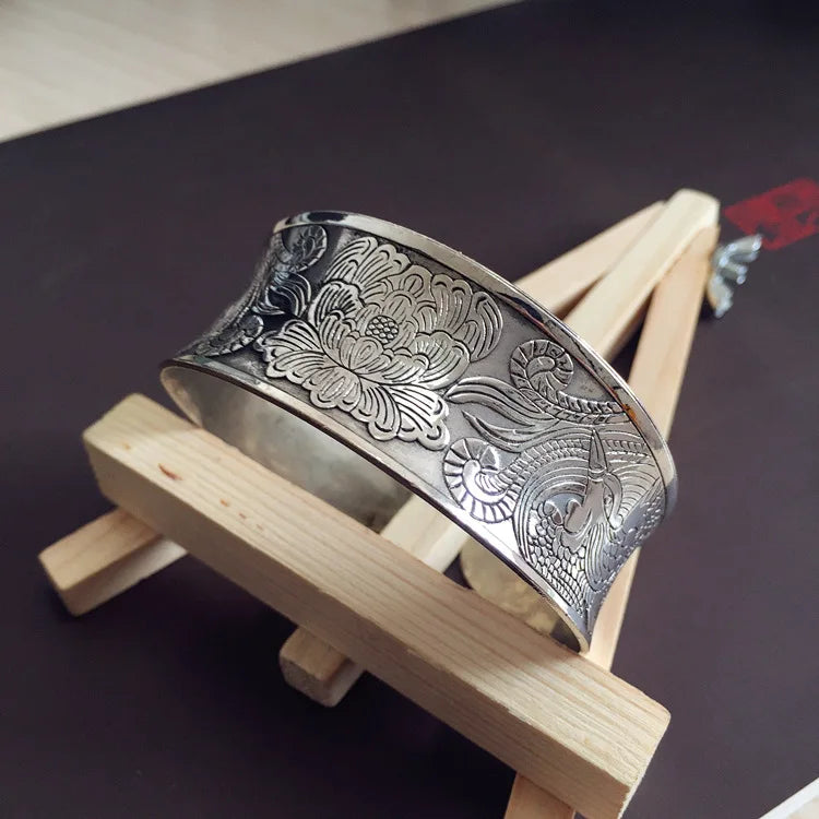 Bohemian Ethnic Retro Silver Wide Cuff Bracelet for Women – Carved Flower Opening Bangle Vintage Boho Jewelry